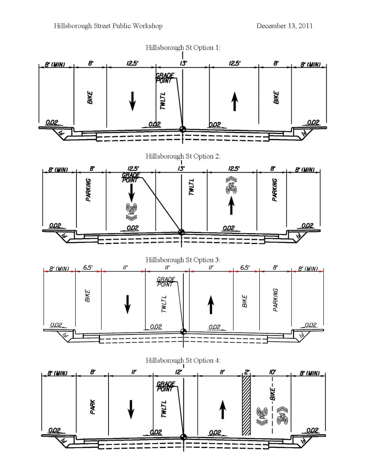 A nearby neighborhood group, the Cameron Park Neighborhood Association, wants on-street parking on both sides of Hillsborough. Raleigh’s Bicycle and Pedestrian Advisory Commission, of which I am a member, studied the issue and recommended two 6-foot bike lanes with parking on ONE side of the street only.